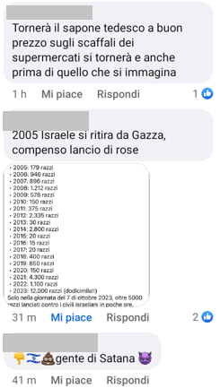 Stampa 12 Luglio 2025 Facebook, commenti di apologia alla Shoah Luogo: Facebook Fonte: Segnalazione “Tornerà il sapone tedesco a buon prezzo sugli scaffali dei supermercati” “gente di Satana”
