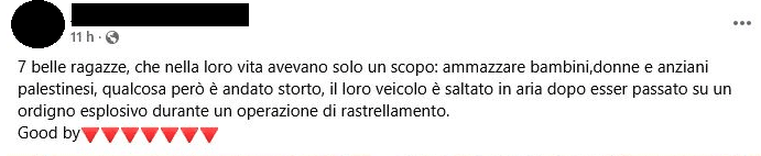 Un utente italiano festeggia l’uccisione di “sette belle ragazze” che, secondo lui, “nella loro vita avevano un solo scopo: ammazzare bambini, donne e anziani palestinesi”.