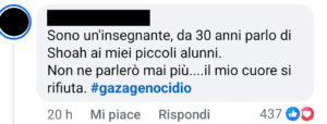 “Sono un’insegnante, da 30 anni parlo di Shoah ai miei piccoli alunni. Non ne parlerò mai più… il mio cuore si rifiuta. #gazagenocidio”