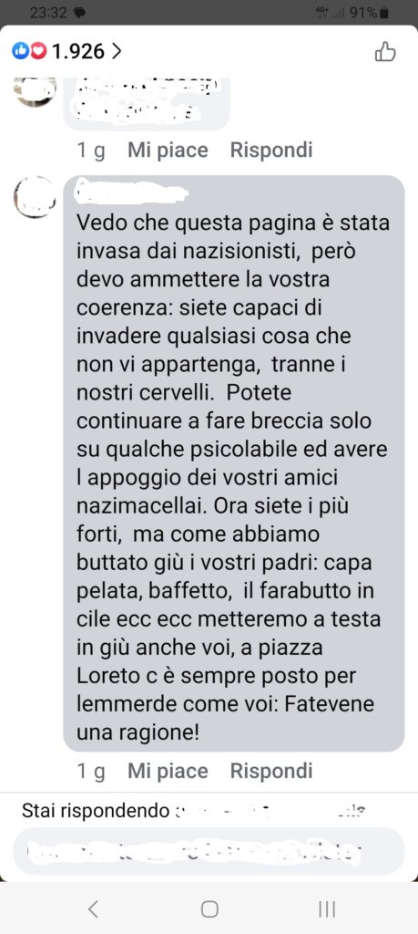 Follower di una pagina Facebook pro pal posta un commento con contenuti antisemiti ritenendo che ci sia una “infiltrazione di nazisionisti”: «Vedo che questa pagina è stata invasa dai nazisionisti, però devo ammettere la vostra coerenza: siete capaci di invadere qualsiasi cosa che non vi appartenga, tranne i nostri cervelli. Potete continuare a fare breccia solo su qualche psicolabile I appoggio dei vostri amici nazinacellai. Ora siete i più forti, ma come abbiamo buttato giù i vostri padri: capa pelata, baffetto, il farabutto in cile ecc ecc metteremo a testa in giù anche voi, a piazza Loreto c’è sempre posto per lemmerde come voi: fatevene una ragione!».