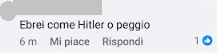 Stampa 11 Giugno 2025 Facebook, commento antisemita sotto ad una notizia Luogo: Facebook Fonte: Segnalazione “Ebrei come Hitler o peggio” Utente italiano commenta così una notizia sulla pagina di un giornale.