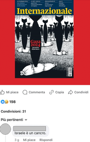 Stampa 20 Giugno 2024 Facebook, commento con contenuti antisemiti Luogo: Facebook Fonte: Segnalazione “Israele è un cancro” Così una donna commenta la notizia sull’account dell’Internazionale.