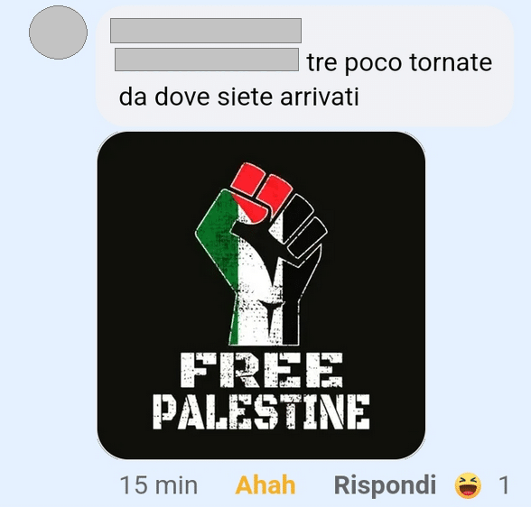 Stampa 23 Maggio 2024 Facebook, commento con contenuti antisemiti Luogo: Facebook Fonte: Segnalazione CE Donna tagga una persona ebrea su Facebook e scrive: “Tra poco tornate da dove siete arrivati”.