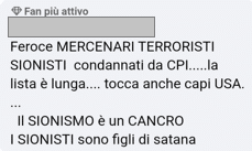 Stampa 26 Maggio 2024 Facebook, commento con contenuti antisemiti Luogo: Facebook Fonte: Segnalazione “I sionisti sono figli di satana” Utente di origine araba pubblica commento con contenuti antisemiti su Facebook.