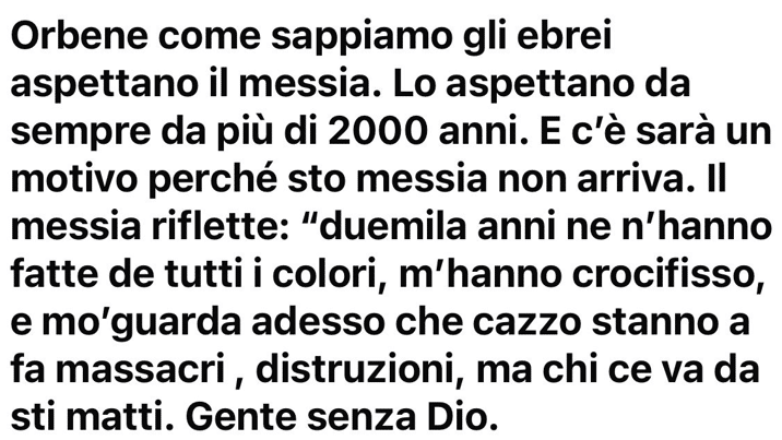 Un uomo responsabile della formazione politica di un partito di estrema sinistra, a Roma, condivide questo pensiero su Facebook: “Orbene come sappiamo gli ebrei aspettano il messia. Lo aspettano da sempre da più di 2000 anni. E c’è sarà un motivo perché sto messia non arriva. Il messia riflette: “duemila anni ne n’hanno fatte de tutti i colori, m’hanno crocifisso, e mo’ guarda adesso che cazzo stanno a fa massacri, distruzioni, ma chi ce va da sti matti. Gente senza Dio.”