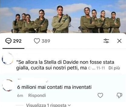 Pagina Facebook pro Israele pubblica un post dove è scritto che se ci fosse stato Israele la Shoah non avrebbe avuto luogo, e un utente provoca in chiave negazionista: «sei milioni mai contati ma inventati».