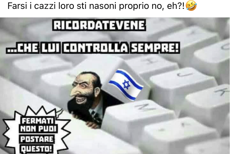 Stampa 10 Luglio 2023 Facebook, complottista neonazista offende gli ebrei Fonte: Segnalazione CE «Questi nasoni giudei…» Simpatizzante neonazista, gestisce alcuni profili Facebook dove posta commenti complottisti e antisemiti.