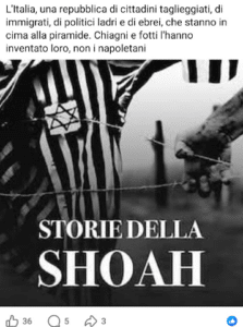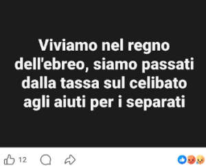 Un altro utente condivide una notizia falsa sul suo profilo Facebook, scrivendo poi: “Ebrei immonde bestie maledetti da uomini e dei”