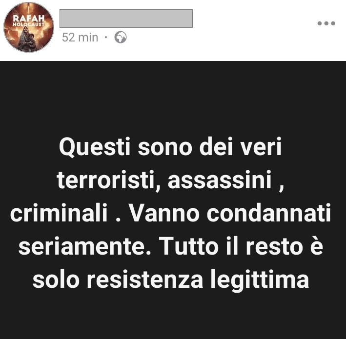 Stampa 19 Settembre 2024 Facebook, donna pubblica post con contenuti antisemiti Luogo: Facebook Fonte: Segnalazione “Tutto il resto è solo resistenza legittima”