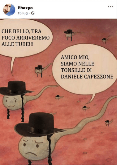Fingendosi Fabio Fazio, il profilo – che conta 44.300 follower su Instagram e 22.000 su Facebook – condivide vignette con contenuti antisemiti e di distorsione della Shoah.
