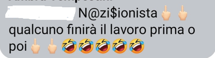 Stampa 18 Gennaio 2024 Facebook, estremista filoaraba lancia insulti e auguri di morte Fonte: Segnalazione “Torna nei forni crematori putt… di mer…” Estremista filo-islamica attacca un’altra utente Facebook – tacciata d’essere “nazisionista” – augurandole di morire nei forni crematori.