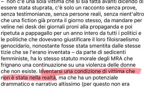 Giornalista di una importante testata dopo i massacri islamisti del 7 ottobre 2023, posta sul suo profilo Facebook vari commenti con contenuti antisemiti, nega che le donne israeliane siano state stuprate dai terroristi di Hamas e sostiene che il conflitto sia stato una false flag architettata dai “sionisti” per poter sterminare i palestinesi poiché: «Israele sia uno stato organicamente razzista, suprematista e genocida non da ora ma dalle sue fondamenta, dallo sciovinismo etnonazionalista alla radice del progetto sionista stesso.»