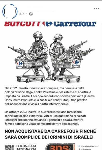 Utente Facebook pro pal posta un meme che incita al BDS nei confronti della catena di supermercati Carrefour. “Carrefour sionista” è uno dei miti di accusa dell’antisionismo pro pal, che taccia il noto marchio francese di contribuire al “genocidio” degli arabo-palestinesi e di essere una componente della lobby sionista mondiale. Il BDS contro Carrefour assume spesso connotati vandalici.