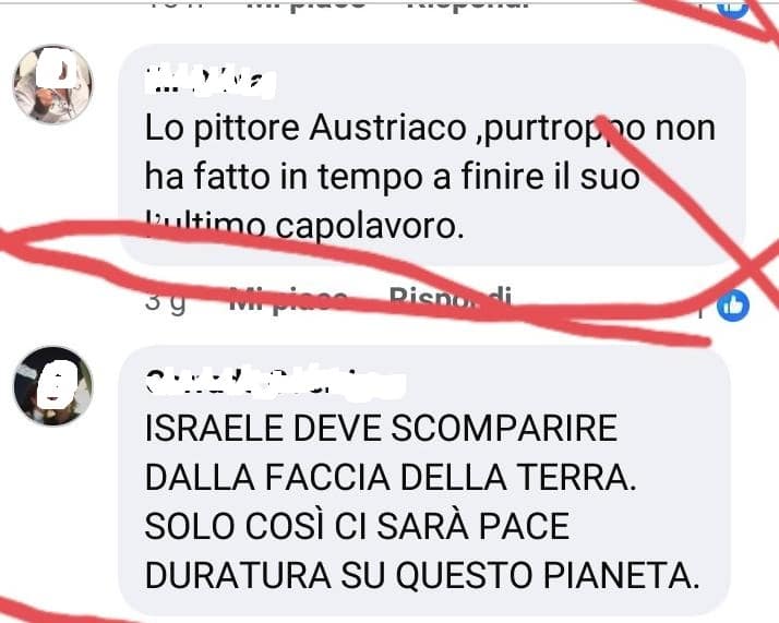 Canale Facebook giornalistico pubblica una notizia secondo la quale lo stato di Israele vorrebbe “giustiziare” un gruppo di prigionieri palestinesi, seguono commenti antisemiti che inneggiano alla Shoah («Lo pittore Austriaco [Hitler, ndr], purtroppo non ha fatto in tempo a finire il suo l’ultimo capolavoro»).