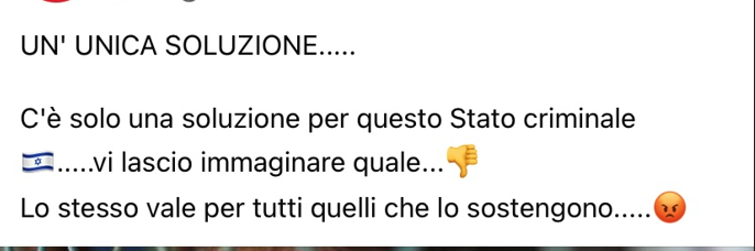 Utente Facebook di Trieste  posta commenti dove auspica la “soluzione finale” di Israele e dei sionisti, inoltre scrive commenti che demonizzano i “sionisti”: demoniaci, niente di umano, feccia, criminali, gentaglia.