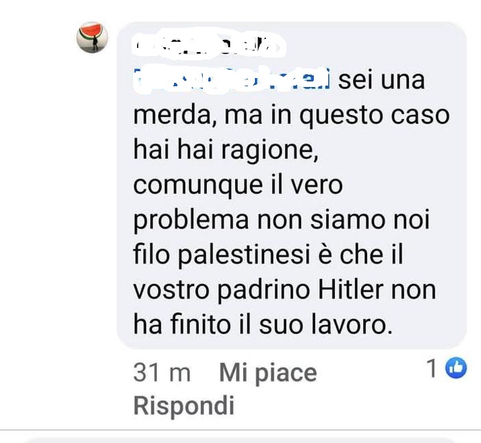 Discussione Facebook sul conflitto tra Hamas ed Israele, un utente risponde così ad un “sionista”: «sei una mer…, ma in questo caso hai ragione, comunque il vero problema non siamo noi filo palestinesi è che il vostro padrino Hitler non ha finito il suo lavoro».