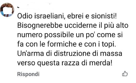 Utente Facebook pubblica il seguente messaggio che incita all’uccisione degli ebrei: «Odio israeliani, ebrei e sionisti! Bisognerebbe ucciderne il più alto numero possibile un po’ come si fa con le formiche e con i topi. Un’arma di distruzione di massa verso questa razza di merda!».