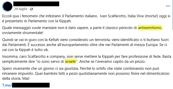 “Eccoli qua i fenomeni che infestano il Parlamento italiano. Ivan Scalfarotto, Italia Viva (morta!) oggi si è presentato in Parlamento con la Kippah. Quale messaggio vuole mandare non è dato sapere, a parte il classico pericolo di antisemitismo, ovviamente strumentale! Quindi se vai in guro con la Kefiah vieni considerato un terrorista, vieni identificato o ti buttano fuori dai Parlamenti. È successo anche all’europarlamento oltre che nei Parlamenti di mezza Europa. Se ci vai con la Kippah è tutto ok. Insomma, caro Scalfarotto e company, non serve mettere la Kippah per fare professione di fede. Basta semplicemente dire “io sono servo di israele”. Anche se l’avevamo capito da un pezzo. Spero vivamente che un giorno ci sia giustizia. Perché lo schifo che state combinando non può rimanere impunito. Quei bambini fatti a pezzi quotidianamente non possono finire nel dimenticatoio della storia. Mai!”