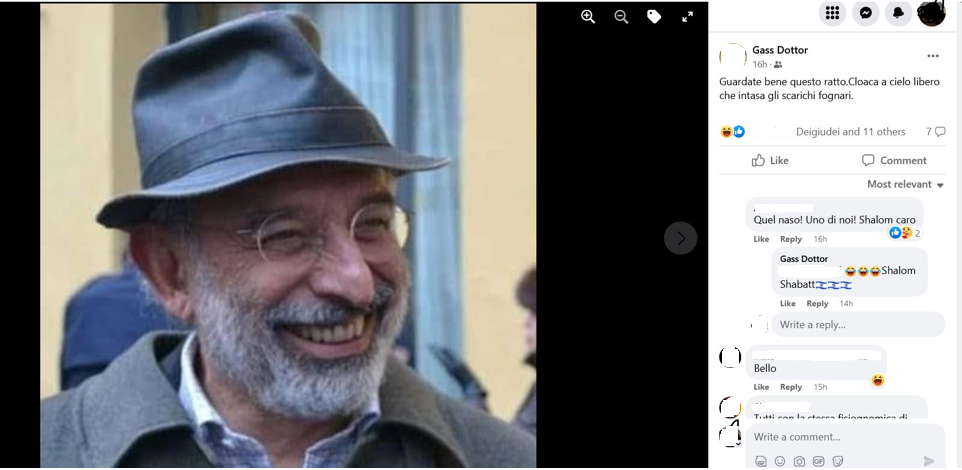 L’ utente Facebook “Gass Dottor”, membro di una informale rete social di propagandisti della giudeofobia, insulta Gad Lerner definendolo ratto e ironizzando sul suo naso da ebreo, anche i commentatori del post usano la stessa cifra dell’irrisione antisemita.