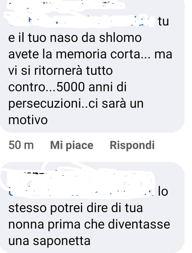 Stampa 25 Gennaio 2024 Facebook, insulti antisemiti Fonte: Segnalazione CE «il tuo naso da shlomo» Utente Facebook ne offende un altro con grevi insolenze antisemite.