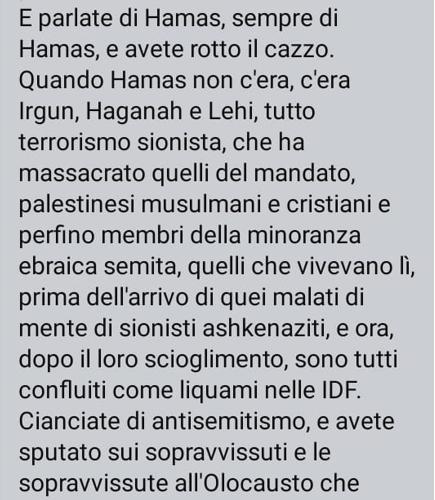 Il conflitto tra Hamas ed Israele genera numerosi forum di dibattiti sulle piattaforme sociale, in una discussione su Facebook i “sionisti” vengono insultati in modo becero. Qui di seguito una breve antologia di invettive: «Avete rotto il caz…Andatevene a fanc…meritate di essere cacciati da ogni luogo…filogenocidi assassini…siete le vergogna dell’umanità…stai zitta mer…ti bevi la propaganda sionista come pisc…vai a cag…siete la feccia della terra…state sui cogl…all’umanità intera…[ebrei] dovete vergognarvi di esistere».