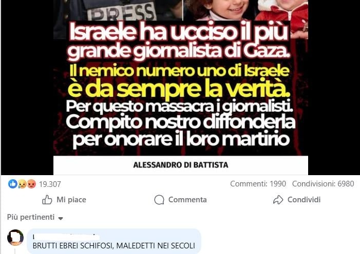 Vari utenti Facebook postano invettive antisemite ispirate al conflitto di Gaza, qui di seguito un breve florilegio dei loro post: «L’ebrei razzaccia. Sono pieni di soldi,dove l’hanno fatti….BOHH; Gli ebrei si nascondono dietro alla memoria,ma si comportano peggio dei nazisti,e chi li difende e’un leccaculo complice; Essere ebrei non deve fare paura ma solo vergognare…; ebrei merde; Che schifo, la comunità ebraica è complice di un genocidio. E ancora parlano di antisemitismo. Il vero pericolo per gli ebrei nel mondo è proprio la loro condotta nel difendere l ‘ indifendibile stato di Isreale. Vergogna; ebrei demoni di merda; Gli ebrei come I fascisti e I nazisti; ebrai razza da estinguere; Sporchi ebrei; Ebrei bastardi carnefici nazisti; ebrei merdosi; Avete rotto con sta difesa in favore degli ebrei !!! Erano sono e saranno odiati sempre e la colpa è solo la loro!!; Gli ebrei sionisti vanno eliminati dal mondo bastardi; BRUTTI EBREI SCHIFOSI, MALEDETTI NEI SECOLI; Beh, se gli ebrei stanno compiendo un vero genocidio….non mi meraviglia nulla; Basta dobbiamo cominciare a mandare fuori dall’Italia gli ebrei sionisti che comunque sono troppo interessati alle bellezze d’Italia. Io ho molta paura. Gli ebrei e quelli che li difendono come te devono andare al rogo tutti insieme.; Mattarella non è in grado di ribellarsi.; Criminali Ebrei popolo sanguinario un orrore vergogna razzisti e nazzisti; Il giorno della memoria sull’olocausto, gli ebrei, essendo una razza paragonabile agli animali feroci della giungla e quindi potenzialmente estinguibili, non lo conoscono, non lo vogliono e non lo commemorano. Hitler, figlio illegittimo di un ebreo. Gli ebrei hanno la mente malata. Mi dispiace per gli ebrei che credono alla pace e alla fratellanza. (saranno 10/12 di loro sparsi per il mondo); Peccato che quello nell’ultima guerra non abbia completato il lavoro ! amica di netahgnau addirittura anche lei complice di genocidio».