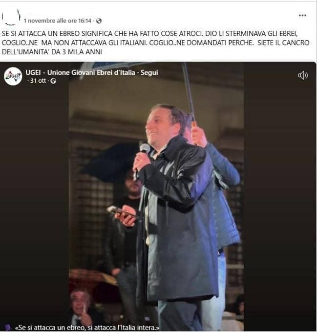Luca Spizzichino, presidente dell’UGEI, prende posizione contro recenti episodi contro gli ebrei, il suo intervento viene ripreso da molti internauti antisemiti che offendono e minacciano in modo becero ed aggressivo il presidente UGEI e gli ebrei in generale, le invettive sono incentrate principalmente sul conflitto tra Hamas ed Israele, ma abbondano anche arcaici miti di accusa, come quello secondo il quale gli ebrei sarebbero malvagi e costituirebbero il Male del mondo.