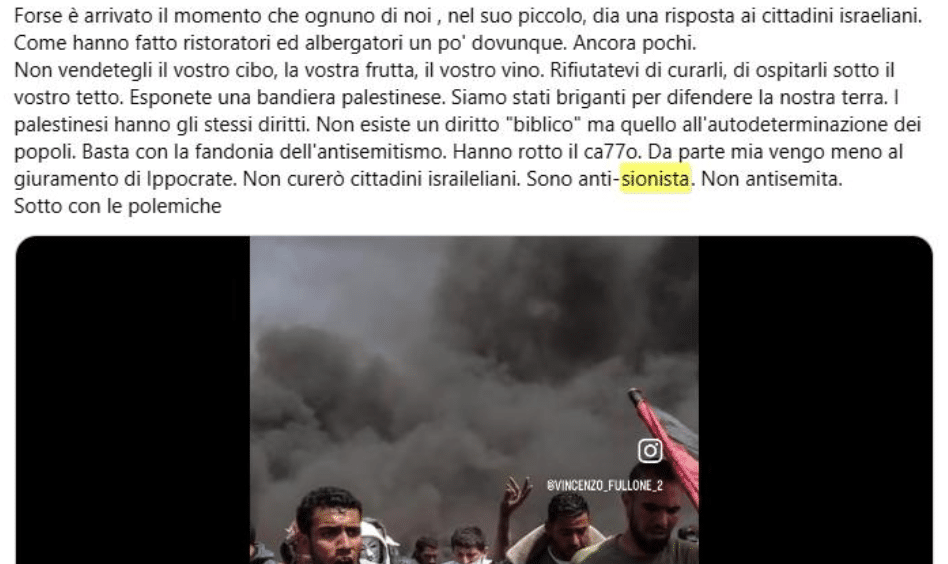 Stampa 23 Giugno 2025 Facebook, medico chirurgo invita a “dare una risposta agli israeliani” Luogo: Facebook Fonte: Segnalazione “Come fanno ristorati e albergatori…”