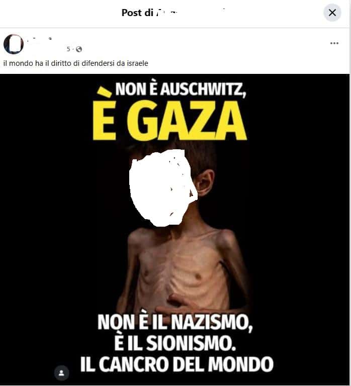 Molti utenti Facebook e di altre piattaforme sociali che simpatizzano per l’ideologia pro pal, condividono la fotografia di uno scheletrico bambino palestinese afflitto da una malattia congenita attribuendo la sua magrezza alla carestia a Gaza causata volutamente dai “sionisti” per sterminare i palestinesi in una nuova Shoah. La fotografia viene accompagnata dallo slogan «Non è Auschwitz, è Gaza Non è il Nazismo, è il Sionismo. Il cancro del mondo». Questo meme viene spesso accompagnato da commenti che auspicano lo sterminio dei “sionisti”, «bestie immonde» che andrebbero messe nei «forni crematori».