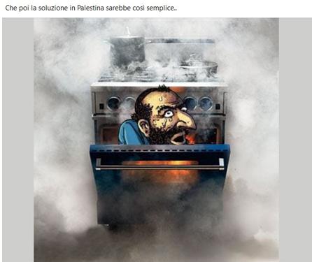 Stampa 23 Novembre 2023 Facebook, meme e commenti antisemiti Fonte: Segnalazione OS «la soluzione in Palestina sarebbe così semplice» Utente Facebook pubblica sul suo profilo social fotomontaggi (tra cui il meme giudeofobico Happy Merchant che brucia in un forno) e commenti antisemiti.