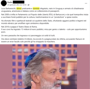 Post che prende di mira il registra e attore Luca Barbareschi: “Ebreo e sionista sfegatato […] sfruttando agganci politici per arraffare ogni centesimo possibile. Il suo covo ha ingoiato 13 milioni di euro […] ma eccolo lì a piagnucolare da vittima”.