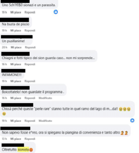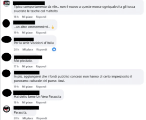 Gli utenti si scatenano nei commenti con insulti antisemiti. “Parassita” “Viscidone d’Italia”, “Chiagni e fo*** tipico di sion” “Uno schifoso sionazi e parassita” “Chissà perché queste perle rare sono tutte in quel RAMO del lago di M…****”