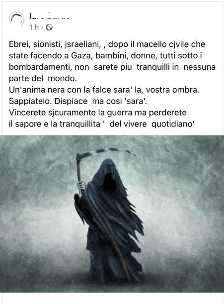 Utente Facebook di Trieste, posta un commento di minacce nei confronti degli ebrei: «Ebrei, sionisti, israeliani, dopo il macello che state facendo a Gaza…non sarete più tranquilli in nessuna parte del mondo…Un’anima nera con la falce sarà la vostra ombra…». Questo utente Facebook posta regolarmente commenti di odio e incitazione alla violenza contro le “cloache sioniste”.