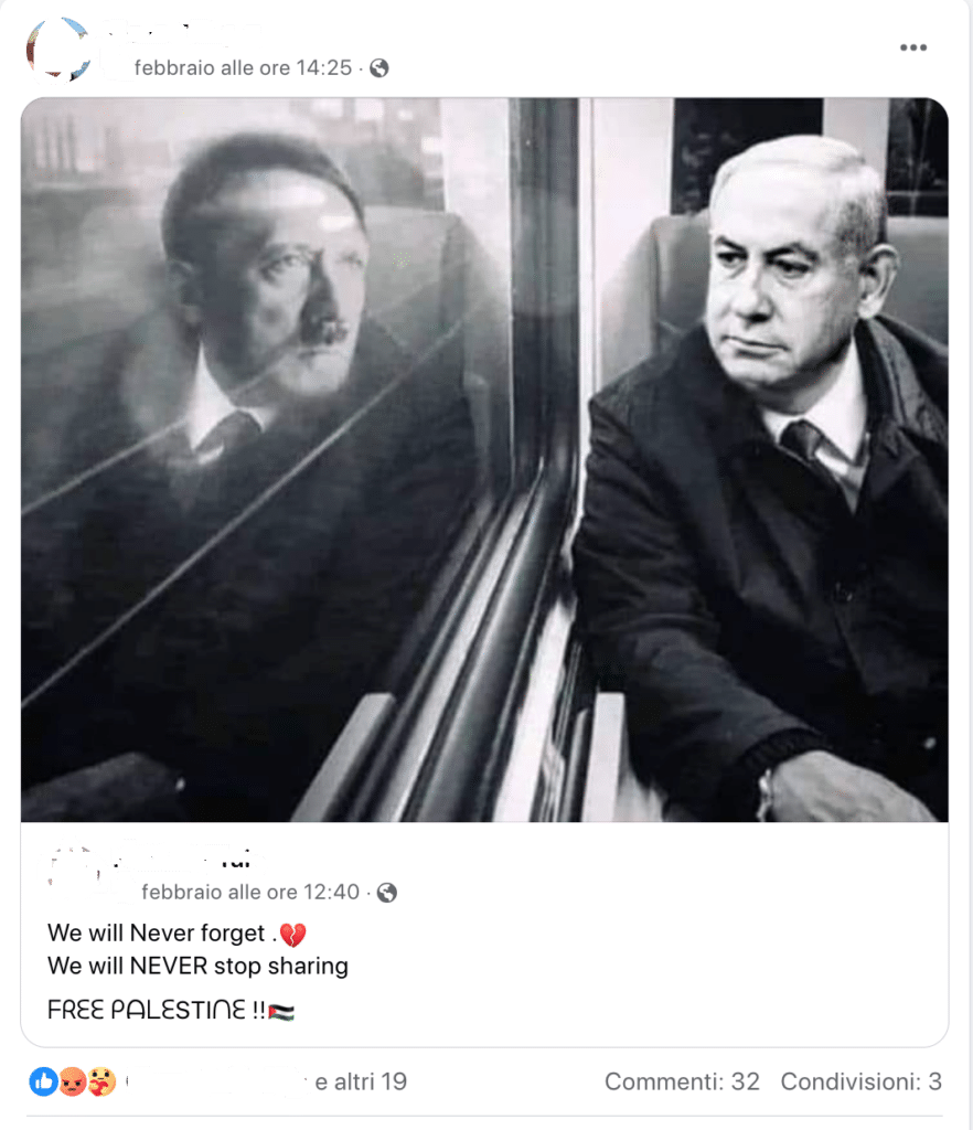 Stampa 19 Febbraio 2024 Facebook, nazificazione di Israele Fonte: Segnalazione CE Fotomontaggio che equipara Natanyahu a Hitler Simpatizzante di sinistra condivide sul suo profilo Facebook un fotomontaggio che paragona il primo ministro israeliano Benjamin Natanyahu al dittatore nazista Adolf Hitler.