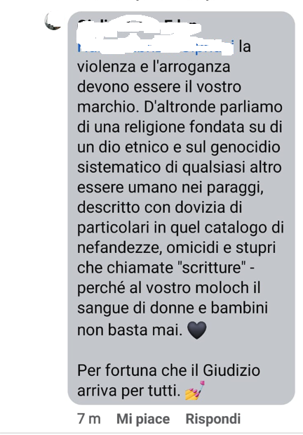 Rabbino italiano da tempo vittima di offese e minacce nel web e nella vita reale, riceve un post Facebook denso di stereotipi antisemiti di matrice antigiudaica che vengono adattati conflitto tra Hamas ed Israele. L’autrice del post di odio sostiene che gli ebrei siano di natura violenta ed omicida e volti al male dalla loro religione sanguinaria.