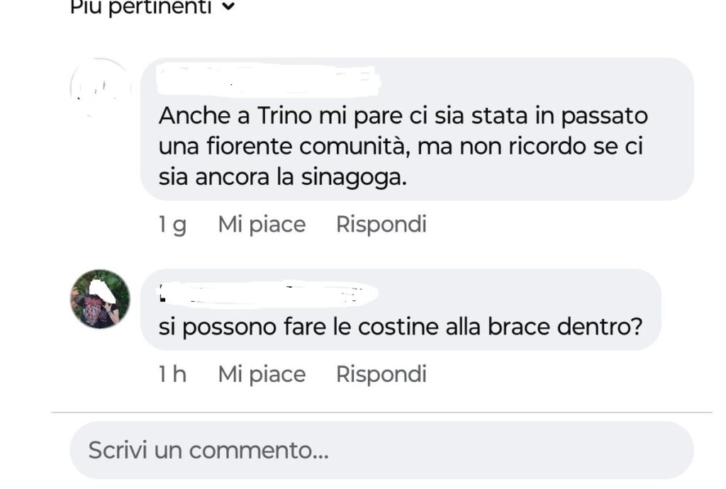 Pagina Facebook di una Comunità ebraica del Nord Italia posta un commento dedicato alla sinagoga cittadina, un utente se ne fa beffe in chiave scrivendo: «si possono fare le costine alla brace dentro?», altri inneggiando alla Palestina.
