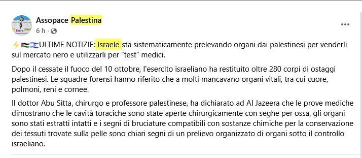 Associazione pro pal accusa lo Stato di Israele di traffico di organi umani: «Israele sta sistematicamente prelevando organi dai palestinesi per venderli sul mercato nero e utilizzarli per “test medici”…l’esercito israeliano ha restituito oltre 280 corpi di ostaggi palestinesi. Le squadre forensi hanno riferito che a molti mancavano organi vitali, tra cui cuore, polmoni, reni e cornee….gli organi sono stati estratti intatti e i segni di bruciature compatibili con sostanze chimiche per la conservazione dei tessuti trovate sulla pelle sono chiari segni di un prelievo organizzato di organi sotto il controllo israeliano». La falsa accusa di traffico di organi umani da parte degli israeliani rinnova l’antico mito di accusa giudeofobico di cannibalismo rituale ed è uno dei cavalli di battaglia dell’antisemitismo arabo-islamico fatto proprio da alcune organizzazioni pro pal.