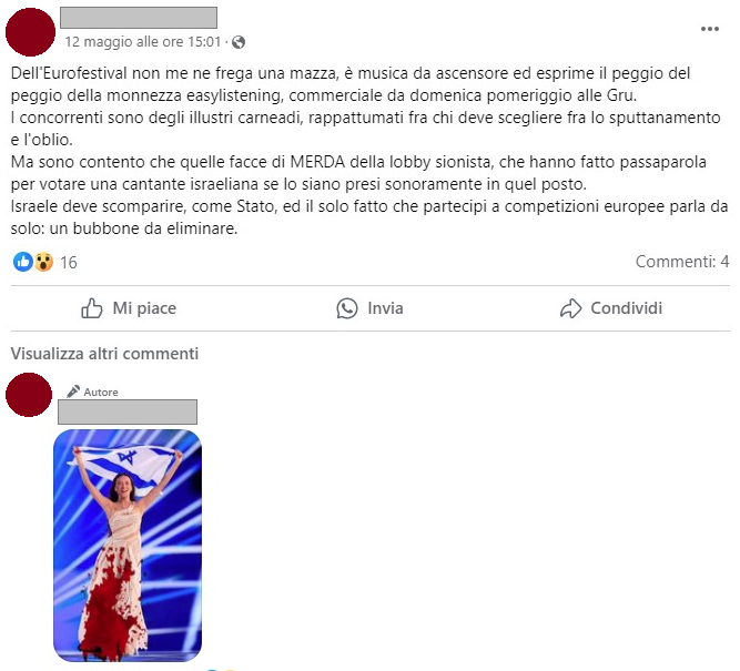 Utente Facebook pubblica la foto della cantante israeliana che ha partecipato all’Eurovision, ritraendo il suo vestito sporco di sangue, allegando il post con insulti contro “la lobby sionista”, dicendo che lo Stato di Israele deve scomparire.