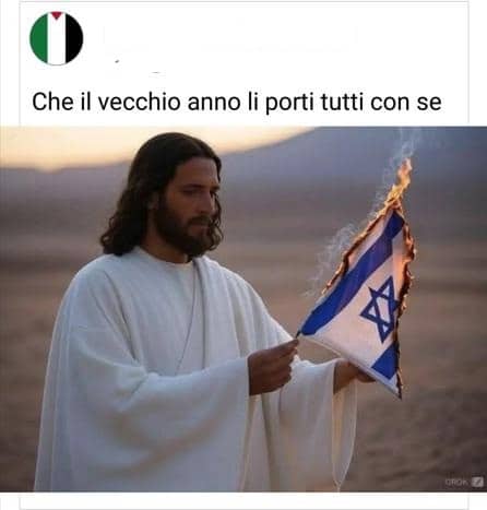 Utente Facebook simpatizzante pro pal pubblica un post con la fotografia di un simil Cristo che brucia una bandiera dello Stato di Israele e l’augurio: «Che il vecchio anno li porti tutti con se». Il messaggio è anche che Israele venga distrutto.
