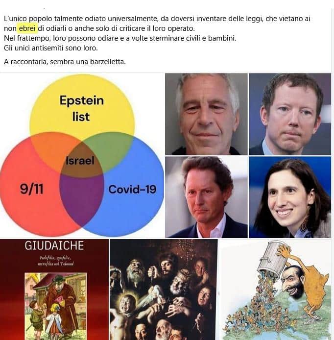 «Diciamoci la verità, anche stavolta ci sono di mezzo loro, anche nel caso Epstein. Da millenni, quando c’è qualcosa di schifoso, orrendo, subdolo, in qualche modo loro c’entrano sempre, e si nascondono dietro la scusa che la gente li odia, ma il ragionamento dovrebbe essere al contrario. Perché la gente li odia tanto o perlomeno li disprezza ovunque vadano? Non sarà il loro atteggiamento, il loro comportamento parassitario, settario, fanatico e soprattutto immorale sotto ogni aspetto? Gli ebrei eskenaziti hanno il Q.I. più alto del mondo, questo è provato, secondi a loro ci sono solo i cinesi Han, ed entrambi manipolano le economie mondiali, dividendosi il mondo senza mai intralciarsi gli uni con gli altri. È curioso, che qui i cinesi vengano chiamati “gli ebrei dell’Asia” e che siano i padroni di tutto, proprietà immobiliari, banche, multinazionali, armamenti, e naturalmente usura. Ma qualcuno di voi ha letto Il Talmud? Leggetevi i passaggi su pansessismo, pedofilia e incesto. Leggete cosa ne pensano e soprattutto cosa pensano, di noi non ebrei. Bisogna essere davvero ingenui, essendo di fede Cristiana, per amare questa gente. È come un topo, che vuole essere amico con il gatto. È come un pollo, che vorrebbe essere accettato dalla volpe. Uno degli aspetti più ridicoli, è che ad ogni critica, quando gli vengono messi davanti agli occhi i fatti, si nascondono dietro la parola “antisemitismo”. La maggior parte della gente, non sa nemmeno chi siano i semiti. Sono gli arabi, e a voi gli israeliani sembrano arabi? Sono come gli australiani o i Nord americani, un’accozzaglia di immigrati bianchi, quasi tutti ucraini, bielorussi o dei paesi dell’Est Europa, che si sono trasferiti, dopo la seconda Guerra mondiale in una terra non loro, inizialmente come profughi, poi reclamando ciò che è stato scritto 3000 anni fa, da chi? Da loro. L’unico popolo talmente odiato universalmente, da doversi inventare delle leggi, che vietano ai non ebrei di odiarli o anche solo di criticare il loro operato. Nel frattempo, loro possono odiare e a volte sterminare civili e bambini. Gli unici antisemiti sono loro. A raccontarla, sembra una barzelletta.»