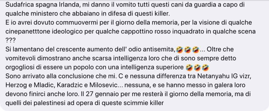 Utente Facebook posta sul suo profilo un articolo dove la dirigente Onu Francesca Albanese attacca pesantemente lo Stato di Israele, e lo commenta paragonando il governo israeliano alle Brigate Rosse, segue il lungo commento di un altro cybernauta che travolge ebrei e “sionisti” di insulti ed invettive (nazisti, bertucce in preda ad orgasmi, etc.), irride l’antisemitismo e si fa beffe del 27 gennaio.