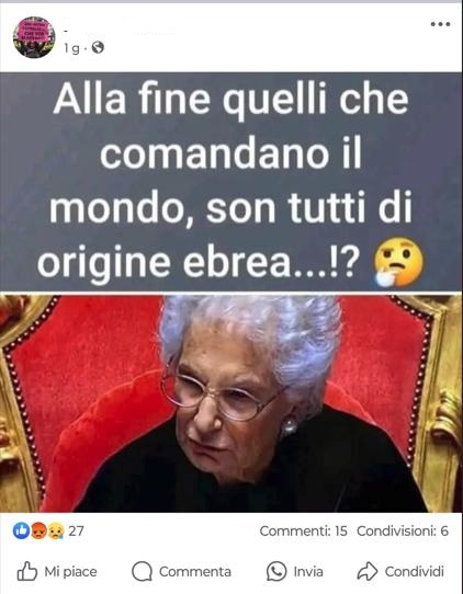 Utente Facebook simpatizzante per l’estrema sinistra, complottista e pro pal, pubblica un post con l’immagine di Liliana Segre corredata da questa frase: «Alla fine quelli che comandano il mondo, son tutti di origine ebrea…!?». Seguono commenti complottisti ed antisemiti che confermano il mito giudeofobico del controllo ebraico sul mondo, eccone alcuni: «certo è la verità. Sono da sempre i cultori del comando.Ne trovi pochi in fabbrica, casomai in ufficio…Sono sionisti askenaziti…askenaziti…Gli ebrei hanno sempre avuto la possibilità e la passione per accumulare enormi ricchezze , praticando il sistema del prestito con interessi . Questo fu persino condannato dalla chiesa come pratica dell’usura e di sfruttamento , fino a quando non furono i nobili e i potenti d’Europa a servirsi dei banchieri, principalmente ebrei, per gestire a questi le ricchezze e proventi derivati dalle terre conquistate e colonizzate per il mondo.Adesso no ci sono regni ne nobiltà a cui dedicarsi e sono diventati loro i regnanti e , i padroni delle partitocrazie in occidente.»