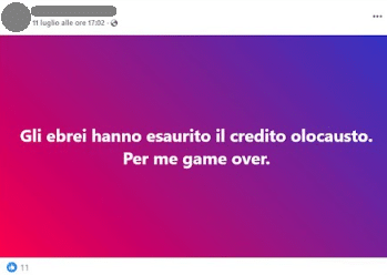 È una affermazione profondamente antisemita perché nega e banalizza la memoria della Shoah, trasformando il genocidio degli ebrei in una sorta di “credito” da revocare, e quindi colpevolizza le vittime storiche insinuando che la loro sofferenza non meriti più rispetto né considerazione. Ritiene, inoltre, gli ebrei collettivamente responsabili per le azioni del governo israeliano.