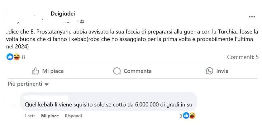 Stampa 15 Gennaio 2025 Facebook, post antisemiti Fonte: Segnalazione CE «squisito solo se cotto dai 6.000.000 gradi in su» Profilo Facebook dedicato alla diffusione dell’antisemitismo in chiave pseudo-umoristica pubblica un post che ironizza sulla morte degli ebrei.