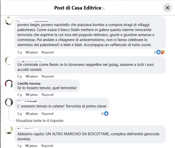 La pagina Facebook di una nota casa editrice specializzata in Judaica promuove la pubblicazione del testo memorialistico di un famoso politico israeliano del passato, seguono decine di commenti antisemiti incentrati sulla demonizzazione del sionismo e dei sionisti visti come razzisti, terroristi e genocidi. In particolare, lo statista israeliano viene mostrificato (nazista, mer…fascista, terrorista assassino, terrorista, razzista e criminale) e, dato che era stato prigioniero dei gulag di Stalin, molti internauti scrivono che avrebbero dovuto ucciderlo nelle prigioni per evitare che si trasformasse in un “sionista genocida criminale di guerra” (Peccato che l’abbiamo lasciato uscire dal gulag…peccato che è sopravvissuto…purtroppo lo hanno liberato…ce lo dovevano seppellire nel gulag) .