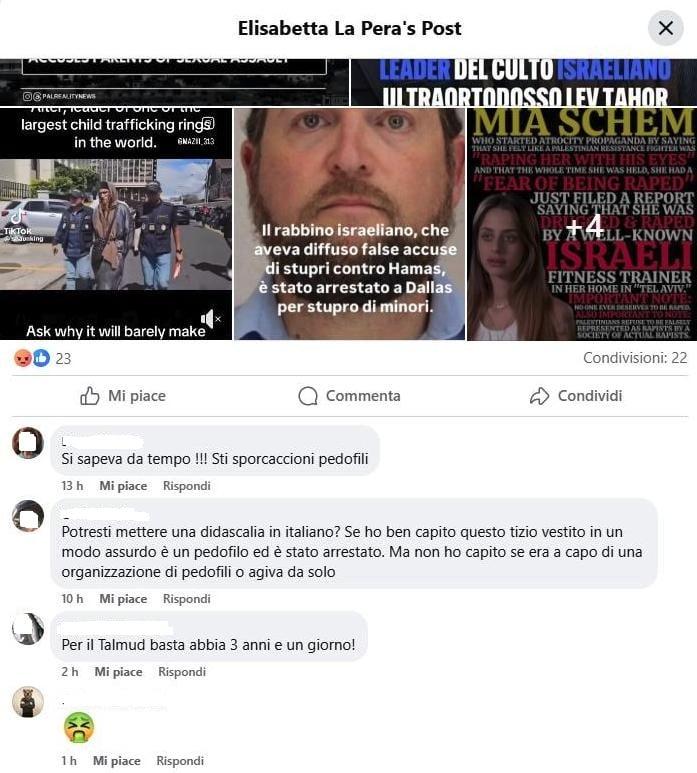 Utente Facebook pro pal pubblica e condivide commenti dove accusa gli ebrei di essere pedofili e stupratori, queste perversioni sarebbero frutto di insegnamenti appresi dal Talmud. In alcuni post vengono accusati di violenza carnale rabbini che avrebbero denunciato gli stupri di Hamas del 7 ottobre 2023, in questo modo l’antigiudaismo (tendenza ebraica alla perversione sessuale, Talmud libro satanico, etc.) si salda con l’antisemitismo legato ad Israele.