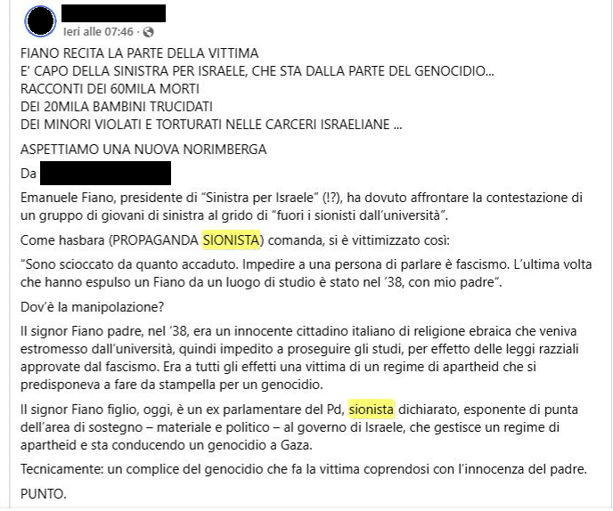 Un utente italiano pubblica un post contro Emanuele Fiano, accusandolo di fare la vittima come comanda la hasbara, termine utilizzato da lui per indicare la “propaganda sionista”, e ritenendolo responsabile, in quanto ebreo, delle azioni dello Stato di Israele.