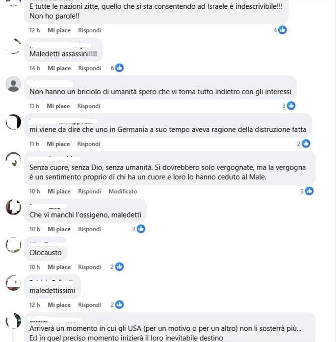 Utenti Facebook prendendo spunto da eventi legati al conflitto a Gaza postano commenti contro gli ebrei. Frequente il paragone tra ebrei e nazisti (siete come/peggio dei nazisti), trivialità varie, miti complottisti e l’ormai consueto (dopo il 7 ottobre 2023) richiamo ad Hitler che “avrebbe dovuto completare l’opera (la Shoah ndr)”.