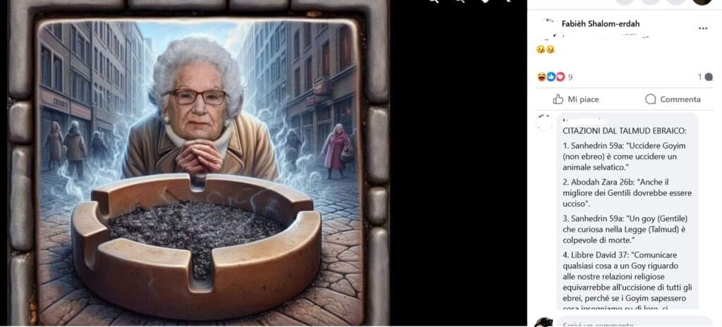 Utente Facebook che fa attivismo antisemita e che per rendere più velenose ed irridenti le sue invettive on line usa come alias la foto di un ebreo religioso ed il nome Shalom-erdah, pubblica un post che mostra la senatrice Liliana Segre intenta ad adorare delle ceneri (sic!), il meme è accompagnato da false citazioni talmudiche e da emojy sghignazzanti.