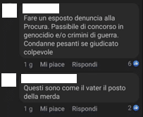 Il profilo di un noto propagandista antisemita, attivo da anni nelle piazze per diffondere la propaganda in difesa dei regimi totalitari pro terrorismo di Hamas, prende di mira un ragazzo italiano sulla sua pagina Facebook, pubblicando le sue foto, accusandolo di aver preso parte a crimini di guerra e facendo i nomi di persone vicine a lui. Una donna italiano ha commentato: “Questi sono come il vater il posto della merda”. Secondo un altro utente, l’uomo dovrebbe essere giudicato per “concorso in genocidio”. L’autore del post è già noto per aver pubblicato in passato foto di esponenti vicini alla comunità ebraica a testa in giù.